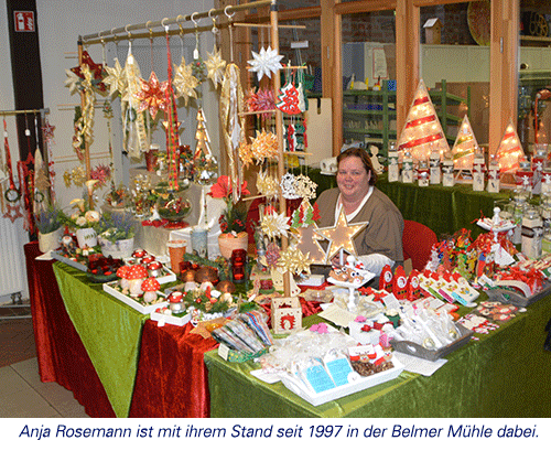 Am letzten Sonntag im Oktober findet traditionell ein Kunsthandwerkermarkt in der Belmer Mühle statt. Mit dem Motto „Herbstgefühle“ hatte der Mühlenverein für die Besucher wieder ein bunt gemischtes Angebot zusammengestellt. In der alten Wassermühle, dem Sägewerk und auch auf der Außenfläche boten zahlreiche Hobbykünstler die selbst gefertigten Bastelarbeiten und kleinere Leckereien zum Kauf an. Seit 1997 gibt es dieses Angebot schon und Anja Rosemann ist Ausstellerin der ersten Stunde. Sie kann sich noch gut an die Anfänge erinnern: „Beim ersten Mal haben wir in kalten und nur provisorisch hergerichteten Räumen unsere Stände aufgebaut“ - und damit sehr gut einschätzen, wie positiv sich die gesamte Mühle entwickelt hat.
